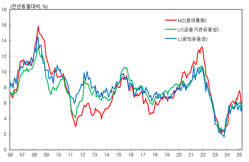 M2는 2023년 5월부터 2025년 2월까지 22개월 연속 상승세를 기록하다가 지난 3월에 23개월 만에 하락 전환한 뒤 한 달 만에 다시 늘었다. 4월 M2의 전년 동월 대비 증가율은 5.7%로 전월 증가폭(6.2%)을 하회했다.