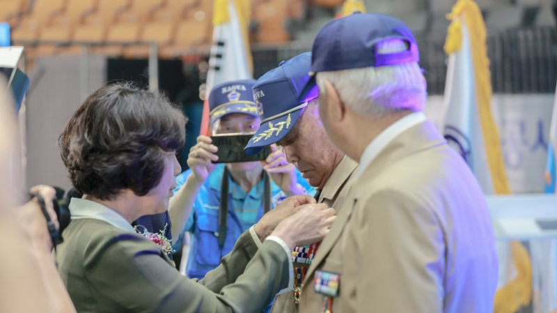 강정애 국가보훈부 장관이 지난해 7월 18일 오후 경기 수원시 장안구 수원실내체육관에서 열린 제27회 고엽제의 날 전우 만남의 장 행사에 참석해 참전용사 대표에게 제복을 입혀 드리고 있다. 국가보훈부 제공