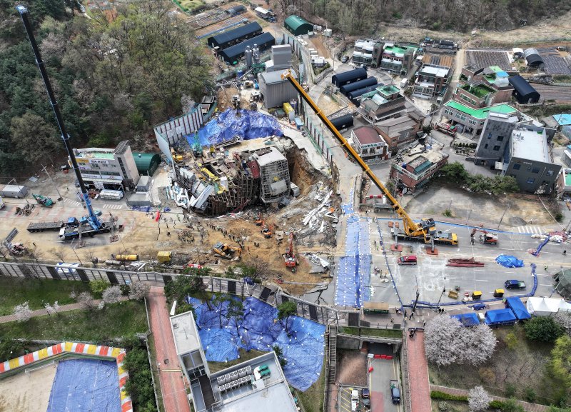 16일 경기 광명시 일직동 신안산선 복선전철 5-2공구 붕괴 현장에서 소방관 등 관계자들이 실종자 수색 작업을 이어가고 있다. 뉴스1
