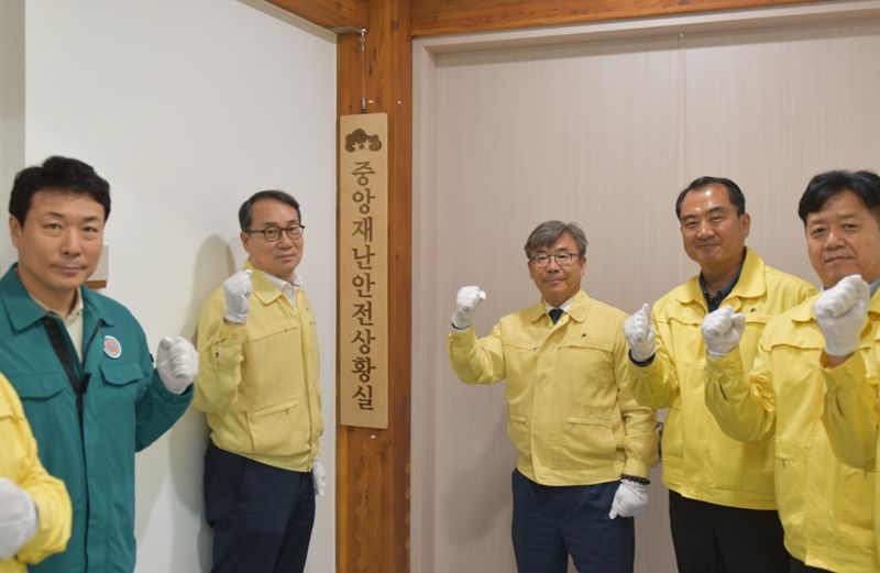 남태헌 한국산림복지진흥원장(오른쪽 세 번째)과 경영진이 16일 중앙안전상황실 현판식을 갖고 재난안전사고에 대한 총력 대응을 다짐하고 있다. 한국산림복지진흥원 제공