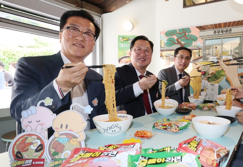 지난 9일 대전 동구 꿈돌이네 라면가게에서 조원휘 대전시의회 의장(왼쪽부터), 이장우 대전시장, 박희조 대전 동구청장이 꿈돌이라면을 시식하고 있다. 뉴스1