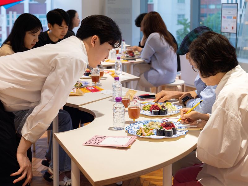 관람객들이 지난 16일 서울 종로구 세화미술관 3층 라운지에서 식사 메뉴에 들어간 식재료를 맞춰보는 '메뉴 카드'를 작성하고 있다. 태광그룹 제공