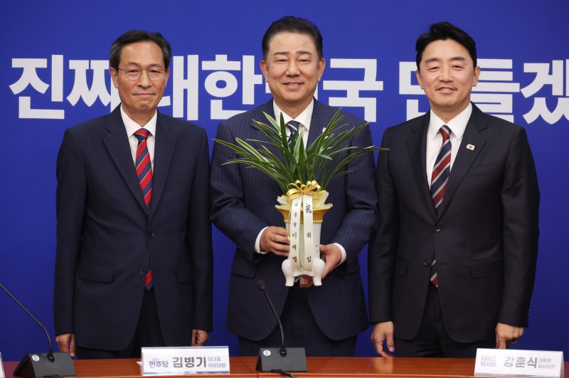 김병기 더불어민주당 당대표 직무대행 겸 원내대표가 17일 서울 여의도 국회에예방온 강훈식 대통령실 비서실장과 우상호(왼쪽) 정무수석에게 이재명 대통령의 축하 난을 전달받고 기념촬영을 하고 있다. 뉴시스