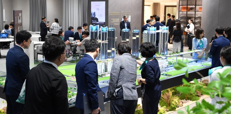 17일 포스코이앤씨 홍보관에 조합원들이 단지모형을 통해 대형평형을 확인하고 있다. 포스코이앤씨 제공