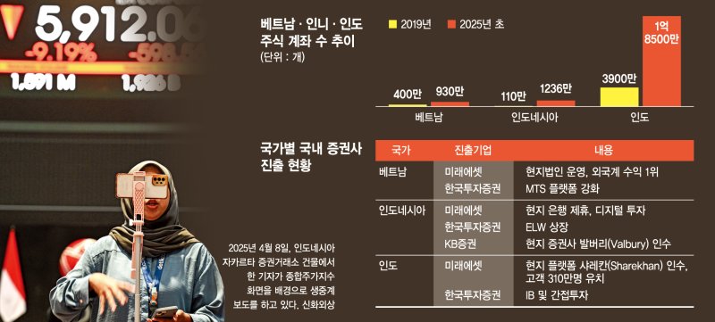 【파이낸셜뉴스 하노이(베트남)=김준석 기자】 동남아시아와 인도 증권시장에서 개인투자자들이 급증하면서 국내 증권사들에게 새로운 기회의 땅으로 부상하고 있다. 특히 베트남·인도·인도네시아를 중심으로 개인 투자자 수가 급증하면서, 현지 주식 계좌 수는 불과 5년 만에 최대 10배 이상 급증한데다 증시도 가파른 성장세를 보이고 있어서다. 특히 각국 정부의 투자 진흥 정책까지 맞물리며 'K증권사'들도 앞다퉈 이들 신흥 지역으로 진출을 확대하고 있다.