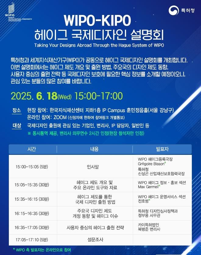 이번 설명회는 국내 사용자들이 WIPO의 국제디자인(헤이그) 출원 제도를 보다 효과적으로 활용할 수 있도록, 제도 전반과 출원 절차에 대한 이해를 높이기 위해 마련됐다. 특히, WIPO 헤이그 등록국(Hague Registry) 소속 전문가들이 직접 제도를 설명하고, 참석자들과 질의응답을 진행할 예정이다.