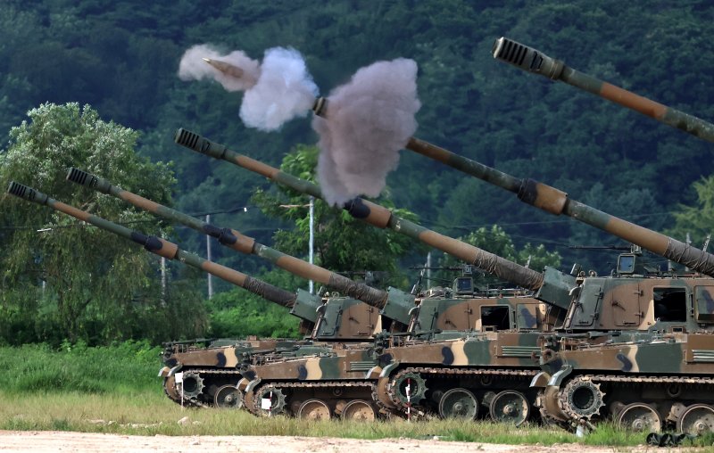 육군 제7포병여단이 운용하는 K9A1 자주포가 지난해 8월 20일 오전 강원도 철원군 문혜리사격장에서 열린 '을지 자유의 방패(UFS)' 연습 연계 지상군구성군사령부(지구사) 대화력전 훈련에서 포탄을 발사하고 있다. 뉴스1