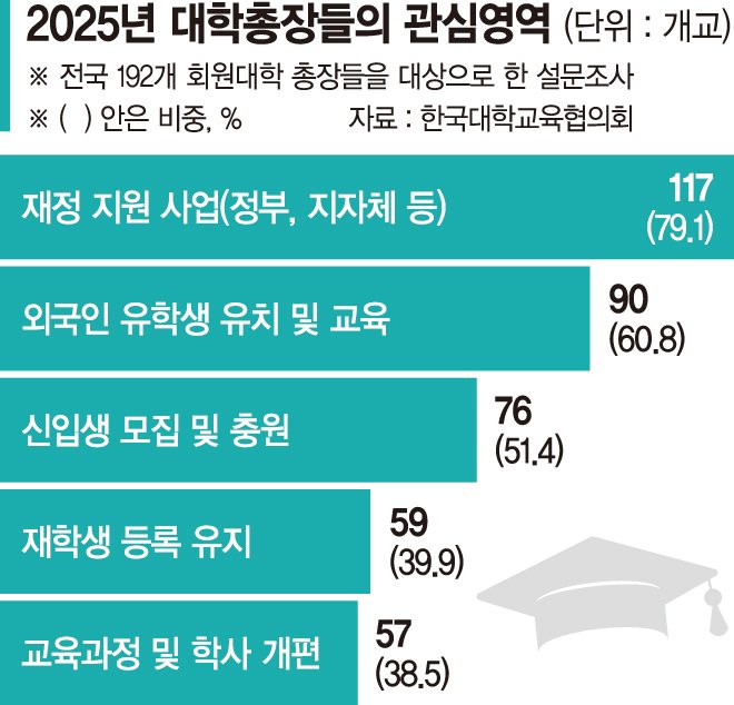 대학 총장들의 주된 관심 영역 1위는 '재정지원사업(정부, 지자체 등)'으로 79.1%인 117개교 총장이 답했다. 2위로는 '외국인 유학생 유치 및 교육'으로 60.8%에 해당하는 90개교 총장이 선택했다. 외국인 유학생에 대한 관심이 높아짐에 따라 2023년 설문조사 이후 처음으로 2위로 진입한 반면, '신입생 모집 및 충원'은 3위로 내려왔다.