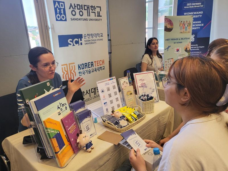 지난 16·18일 독일 베를린 자유대학과 튀빙겐대학 일원에서 열린 ‘2025 독일 한국유학박람회’ 충남도 홍보 부스에서 한 현지 학생이 상담을 받고 있다.