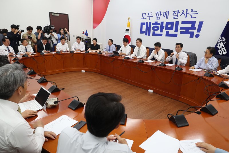 김병기 더불어민주당 당대표 직무대행 겸 원내대표가 19일 오전 서울 여의도 국회에서 열린 정책조정회의에서 발언을 하고 있다. 뉴시스