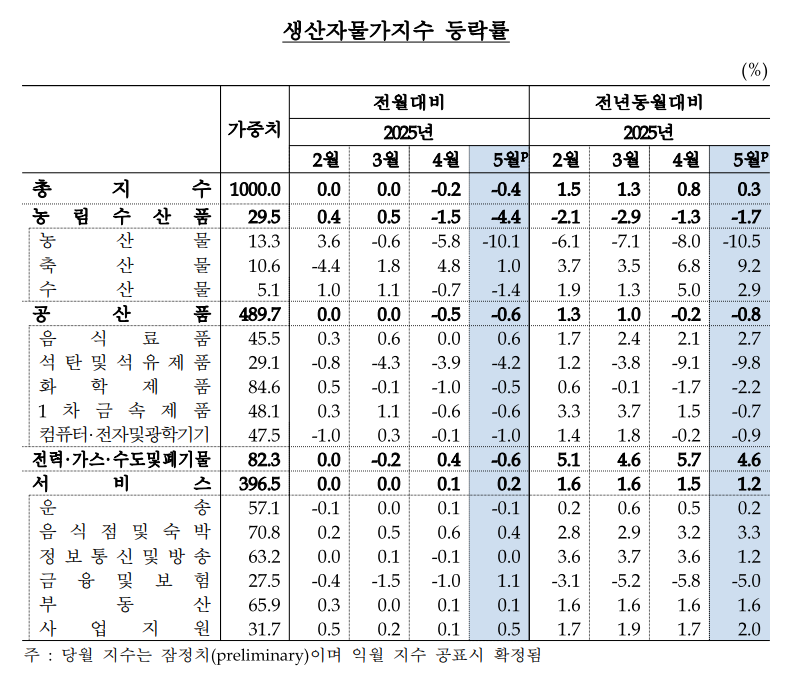 공산품의 경우 음식료품(0.6%)이 올랐으나 석탄 및 석유제품(-4.2%) 등은 내려 전월 대비 0.6% 하락했다.