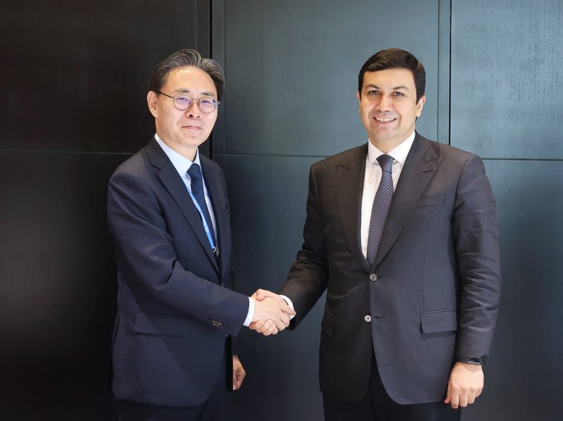 강민수 국세청장(왼쪽)이 지난 18일 '제29차 유럽 조세행정협의기구(IOTA)' 회의에 참석, 오르칸 나잘리 아제르바이잔 국세청장과 기념촬영을 하고 있다. 국세청 제공