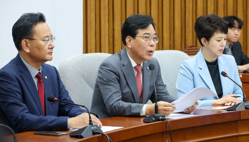 송언석 국민의힘 원내대표가 20일 오전 서울 여의도 국회에서 열린 원내대책회의에 참석해 모두 발언하고 있다. 왼쪽부터 유상범 원내운영수석부대표, 송 원내대표, 김은혜 원내정책수석부대표. 뉴스1