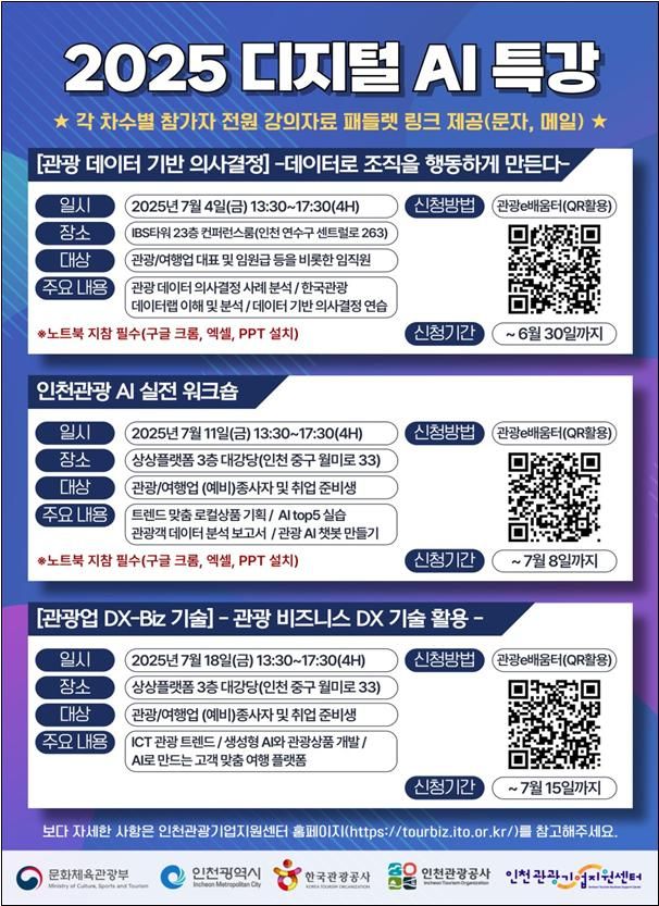 마지막 3회차 ‘관광업 DX-Biz 기술’에서는 인천의 지역 특성을 반영한 정보통신기술(ICT) 기반 스마트 관광과 AI 맞춤형 플랫폼 개발 전략 등을 소개할 예정이다.