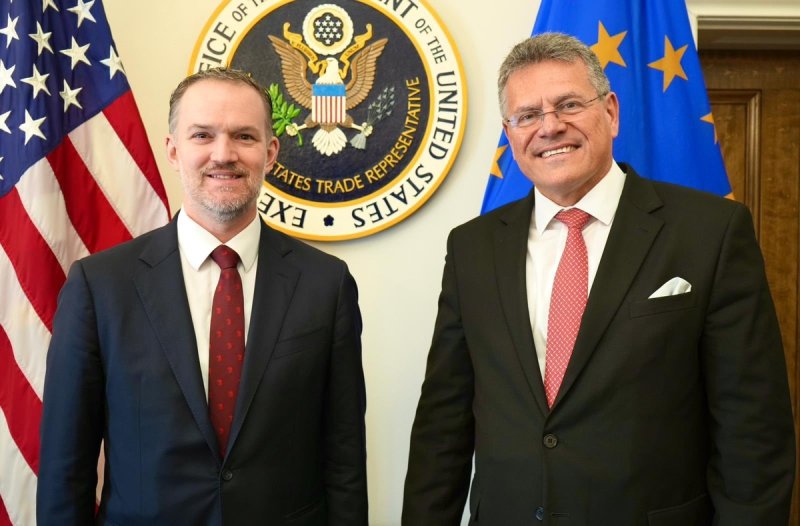 제이미슨 그리어 미국 무역대표부(USTR) 대표(왼쪽)와 마로시 셰프초비치 EU 무역·경제안보 집행위원. 연합뉴스
