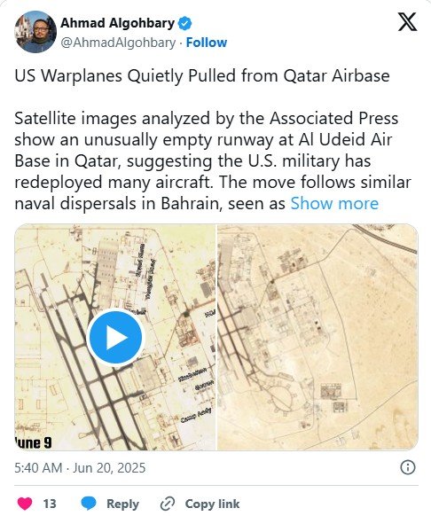 플래닛 랩스 PBC가 촬영한 위성 사진에 따르면 카타르의 알 우데이드 기지에 헤라클레스 C-130 수송기와 정찰기 등 40대 가까운 미군 군용기들이 세워져 있던 것으로 5일 촬영한 위성사진에서 확인됐었다. 그러던 것이 19일 위성사진에서는 단 3대만 남아 있었다. 거의 모든 미군 군용기들이 사라진 상황이다.