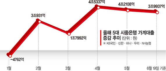 5대 시중은행의 가계대출 잔액이 3주 만에 약 4조원 증가한 것으로 나타났다. 특히 지난 1주(6월 14~19일)간 가계대출 잔액이 2조원 가까이 급증했다. 불 붙은 서울아파트 가격이 부동산 영끌(영혼까지 끌어모아 대출) 수요를 자극하면서 6월 일 평균 가계대출은 약 2100억원씩 불어나고 있다. 이 속도대로라면 이달 5대 시중은행의 가계대출 증가액이 6조원을 넘길 전망이다. 이미 영끌 광풍이 불었던 지난해 8월 직전 수준이라는 분석이 나온다. 이에 시중은행들은 일일 가계대출 증가액을 모니터링하면서 비가격적 가계대출 운영 방안을 추가해서 대출 문턱을 높일 지 검토하고 있다.