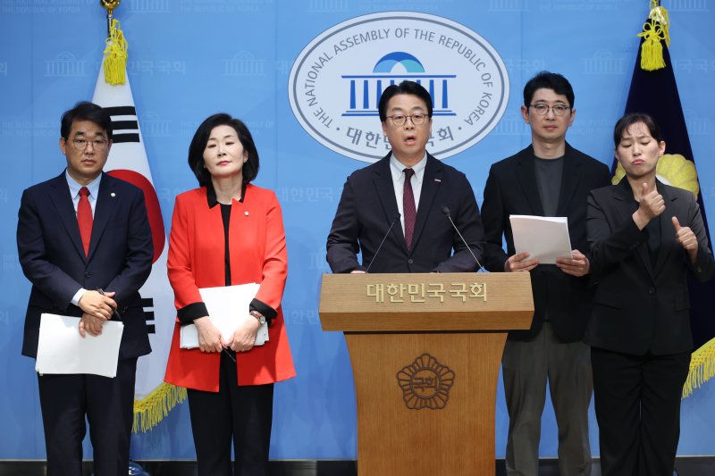 국회 국무총리 인사청문특별위원회 국민의힘 의원들이 23일 오전 서울 여의도 국회 소통관에서 기자회견을 열고 김민석 총리 후보자의 자진 사퇴를 촉구하고 있다. 왼쪽부터 배준영, 김희정, 곽규택, 주진우 의원. 뉴스1
