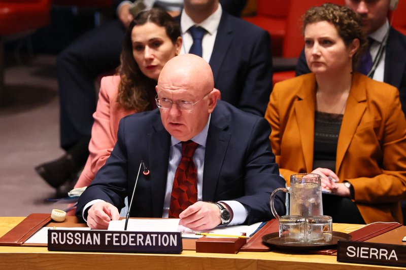 지난 20일(현지시간) 미국 뉴욕의 유엔 본부에서 러시아의 바실리 네벤자 유엔 주재 대사가 유엔 안전보장이사회(안보리) 회의에 참석해 발언하고 있다.AFP연합뉴스