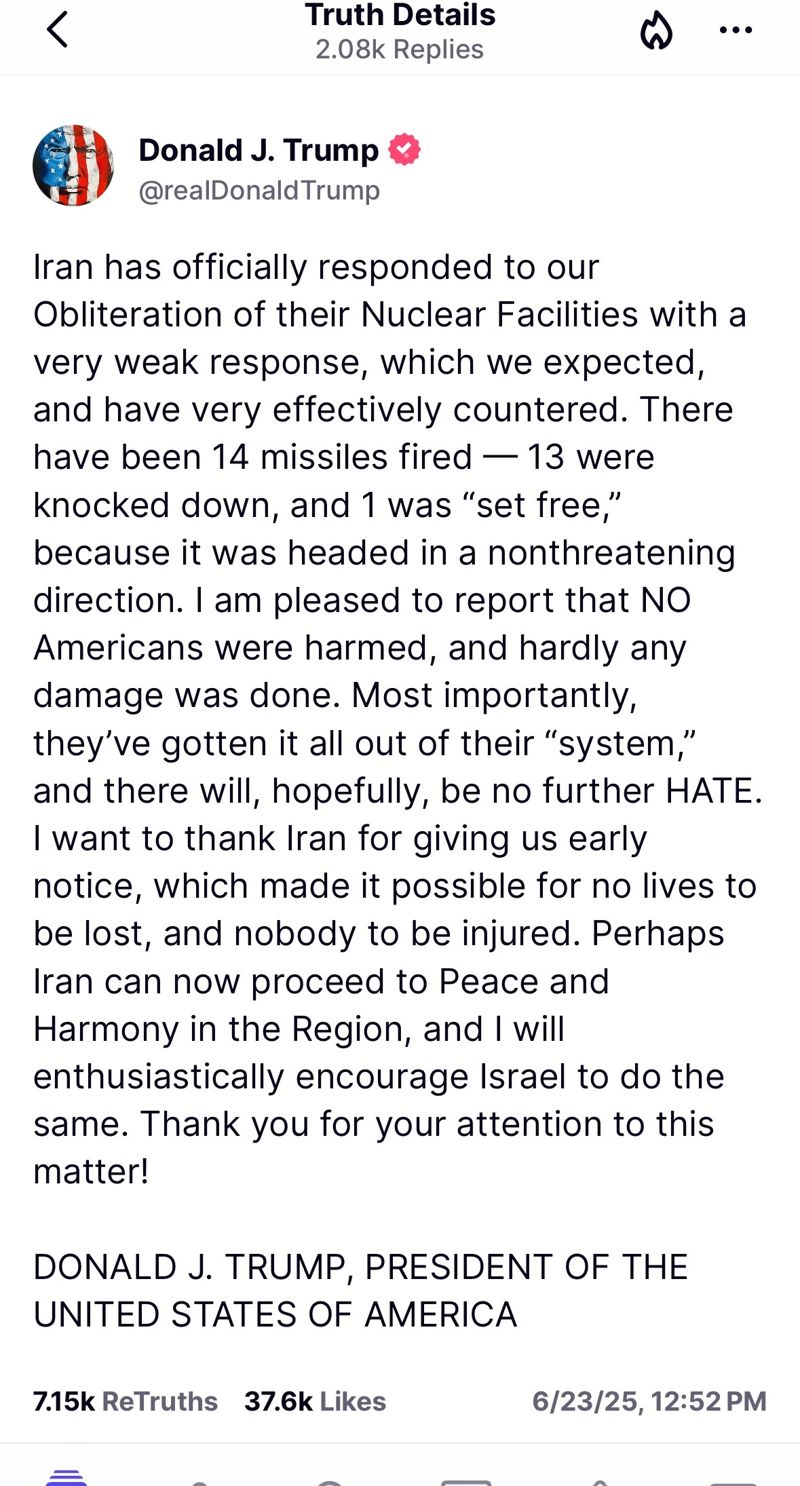 트럼프 대통령은 이날 자신이 설립한 소셜미디어(SNS) 트루스소셜을 통해 "이란은 우리가 그들의 핵시설을 박살 낸 것과 관련 예상대로 매우 약하게 공식 대응을 했다"고 밝혔다.