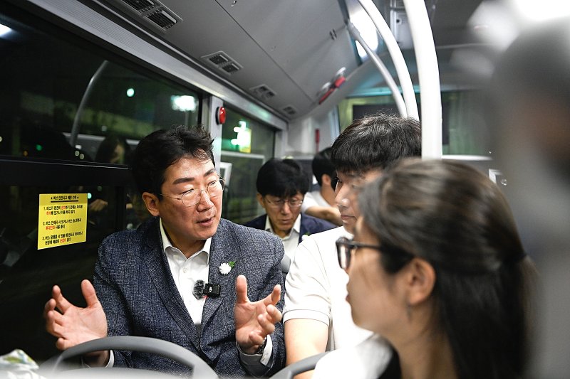 심야버스에 탑승해 청년·대학생 목소리 경청하는 원강수 원주시장. 뉴시스