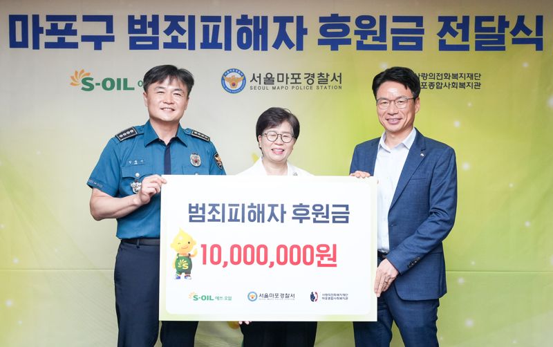 [파이낸셜뉴스] 에쓰오일은 서울 마포구 본사에서 '마포구 범죄피해자 후원금 전달식'을 열고 사랑의전화 마포종합사회복지관에 후원금 1000만원을 전달했다고 24일 밝혔다.