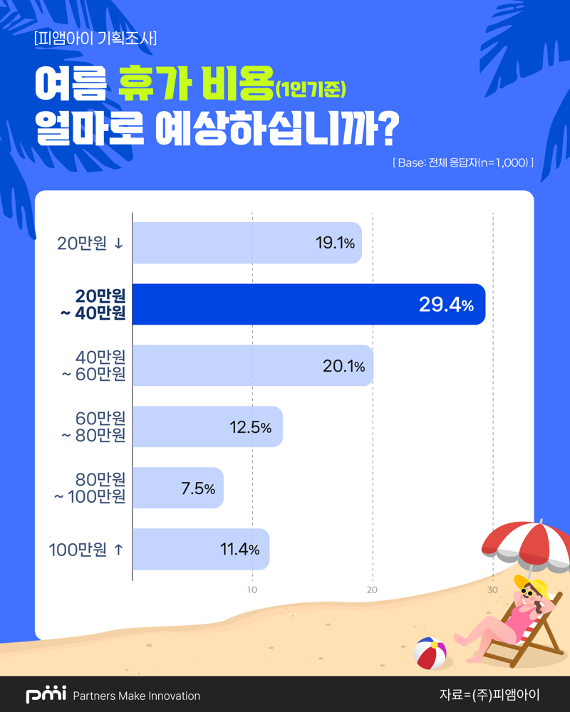 소비자들은 올여름 휴가비로 얼마가 가장 적당하다고 생각할까. 데이터 컨설팅 기업 피앰아이(PMI)가 올여름 휴가 계획이 있는 전국 20~69세 남녀 1000명을 대상으로 실시한 '2025년 여름휴가 지출 계획' 조사에 따르면, 적정한 여름휴가 비용은 20~40만원이라고 답한 비율이 29.4%로 가장 많았다.