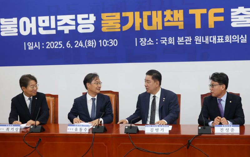 24일 민주당은 첫 원내 태스크포스(TF)로 '물가 대책 TF'를 출범했다. 이날 출범식에 참석한 김병기 민주당 신임 원내대표는 "최근 물가 상승만큼 국민의 고통도 가중되고 있는만큼 물가 안정을 위한 특단의 대책이 필요하다"며 "이재명 대통령이 취임 첫날 1호 행정 명령으로 비상 경제 점검 태스크포스(TF) 설치를 지시한만큼 국회도 이를 지원해야 한다"고 했다.