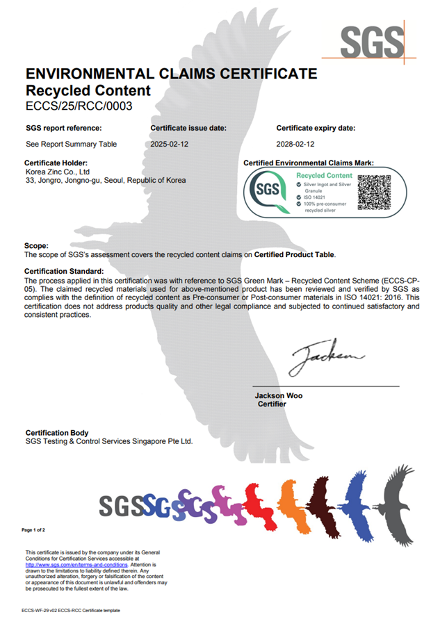 이번 인증은 아연·연 제련 과정에서 발생하는 더스트(Roaster Dust)와 금속 찌꺼기(Anode Slime) 등 부산물에서 고농도 은을 회수한 점이 높은 평가를 받았다. 고려아연은 이 같은 폐기물 기반 회수 기술을 통해 정광 없이 은과 동을 생산하고 있다.
