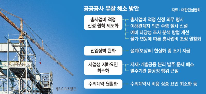 인플레 쇼크는 민자사업 뿐 아니라 대규모 공공공사 사업도 휘청거리게 하고 있다. 최근 몇 년 간 무더기 유찰이 계속 이어지며 사회간접자본 공사가 송두리째 흔들리고 있는 것이다. 세부적으로 보면 프로젝트 특성을 고려한 총사업비 적정 산정 원칙을 제도화 할 필요가 있다는 설명이다. 현재 법에는 총사업비 적정 산정 조항이 없고, 사업비 산정 과정에서 건설업계 의견 수렴 절차도 없다.