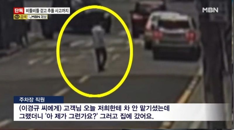 지난 25일 MBN 뉴스에 따르면 약물 운전 혐의로 입건된 코미디언 이경규의 사고 당시 폐쇄회로(CC)TV 영상이 공개됐다. 공개된 영상 속 이경규는 강남구의 한 골목길에서 주차돼 있던 버스를 들이받는 사고를 냈다. 차에서 내린 이경규는 인도가 아닌 차도로 비틀대며 걷기도 했다. 이로 인해 뒤에서 오던 차량 두 대는 중앙선을 넘어 달려야 했다.
