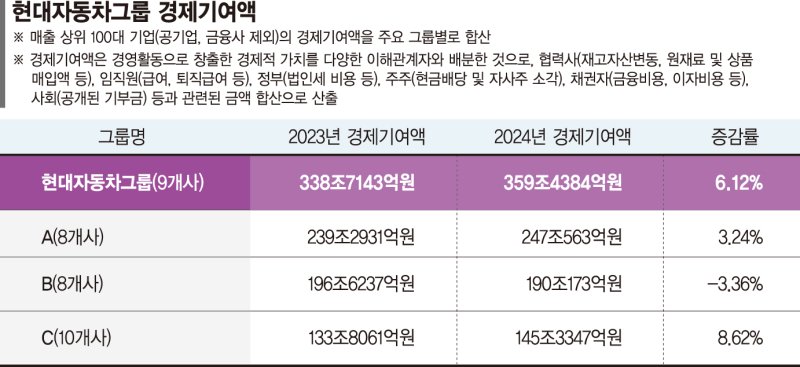 실제 기업데이터연구소인 CEO스코어가 500대 기업 중 사업보고서를 제출한 2024년 매출액 상위 100대 기업을 대상으로 분석한 결과로, 현대차그룹의 경제기여액은 전년대비 6.1% 증가했고 100대 기업 전체 경제기여액에서 차지하는 비중은 같은기간 21.8%에서 22.3%로 0.5%p 상승했다.
