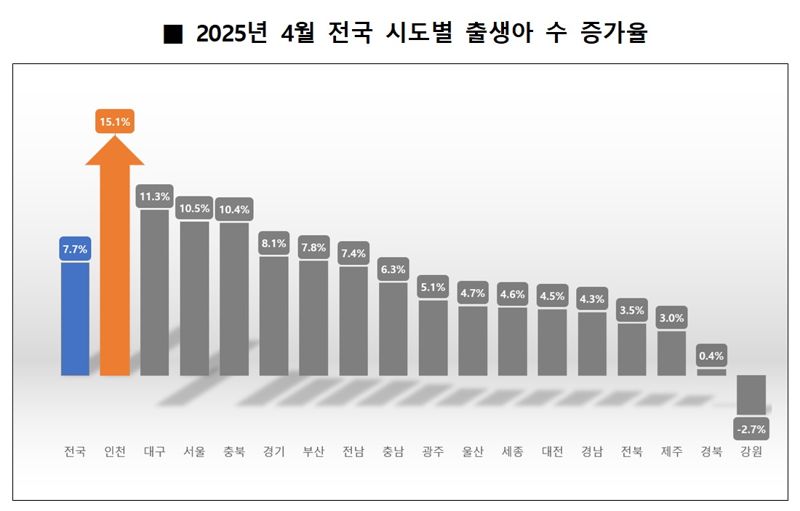 인천시는 지난해 출생아 수 증가율 1위를 기록한 이후 지난해 10월부터 올해 4월까지 매달 두 자릿수의 증가율을 지속적으로 이어오고 있다. 이는 인천시가 선제적으로 추진해 온 저출생 대응 정책의 가시적인 성과로 평가된다.