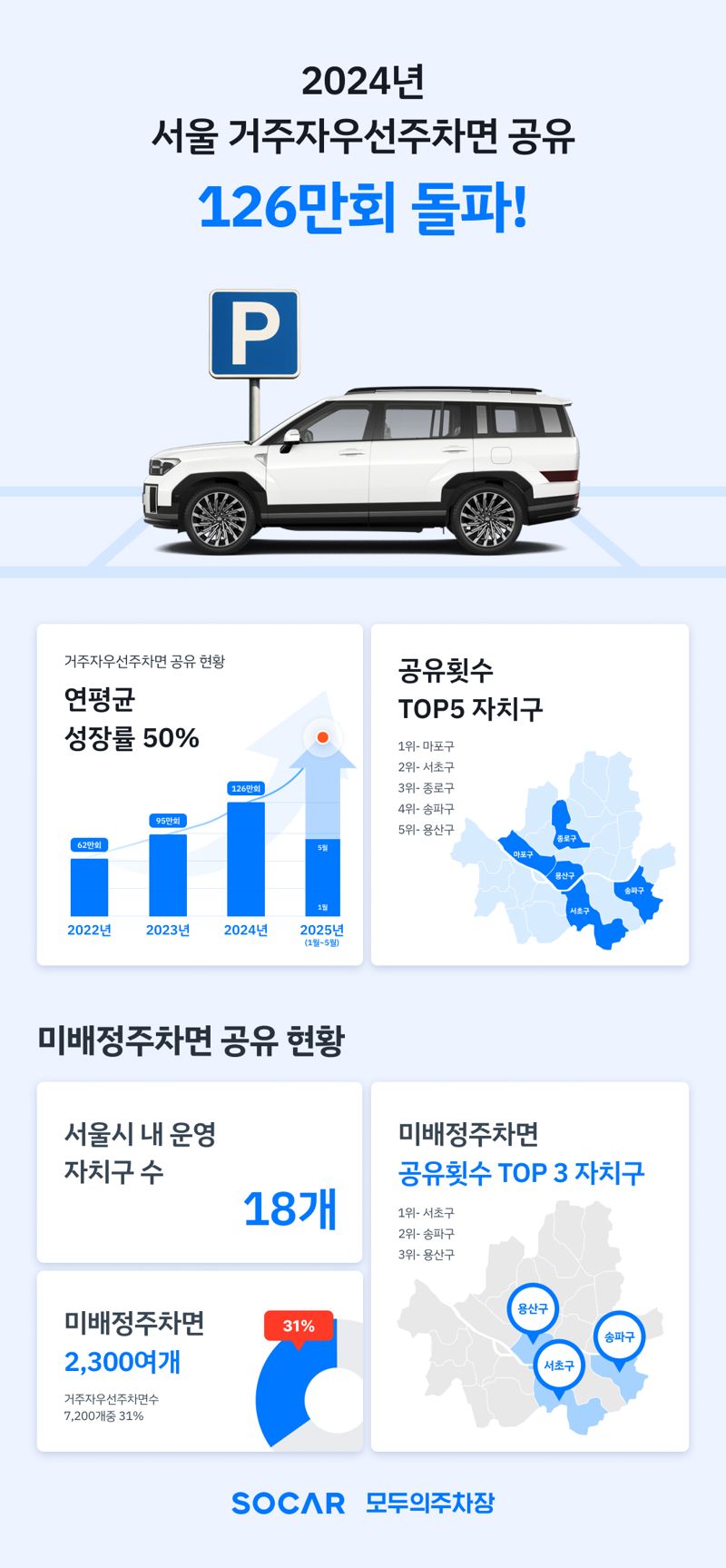 쏘카는 지난해 서울시 내 총 21개 자치구에서 7200여개의 거주자우선주차면을 플랫폼에 등록해 운영했다. 이 사업은 △2022년 62만회 △2023년 95만회 △2024년 126만회 △2025년(1월~5월) 51만회를 기록, 최근 3년새 연평균 약 50%의 높은 성장률을 보이고 있다.