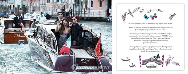 결혼식을 앞두고 베이조스 커플은 200명의 하객에게 청첩장을 발송했다. 청첩장에는 “선물은 사양한다. 대신 베네치아 지역의 유네스코 등 자선단체 세 곳에 기부해달라"는 메시지를 담았다.