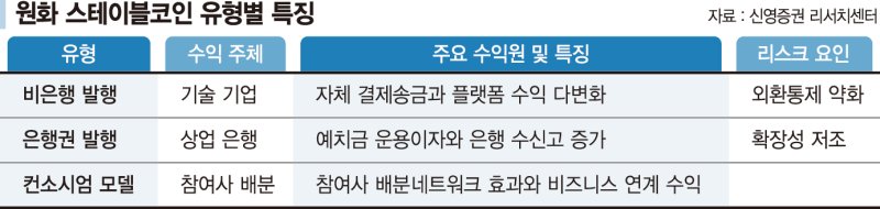 하지만 원화 스테이블코인 실효성 논란은 여전히 높다. 달러 스테이블코인은 기축통화 지위를 기반으로 미국 금융시스템 외부에서도 유동성 유입이 가능하지만 원화 스테이블코인은 글로벌 수요가 제한된 비기축통화 기반으로 국내 유동성의 내부 이동에 그칠 가능성이 높다는 지적이다. 신영증권 임민호 연구원은 "한국은 은행 중심의 신용창출 구조를 갖고 있어 정책당국이 은행 시스템 안정성을 전제로 규제 설계를 병행할 수밖에 없다"며 "미국과 한국 금융시스템의 구조적 차이 등은 원화 스테이블코인의 유통 확대를 제한해 수익 확장성 측면에서 구조적인 제약 요인으로 작용할 것"이라고 주장했다.