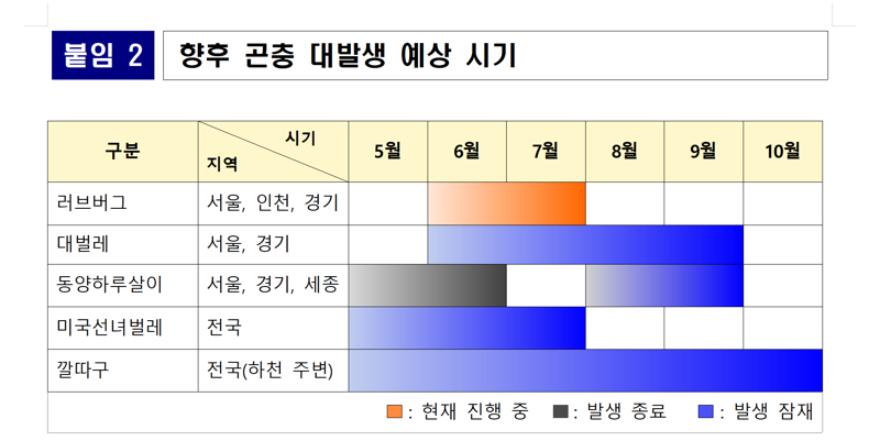 한편 환경부는 올해 다른 곤충도 대발생이 나타날 가능성을 배제할 수 없으므로 지자체와 연계한 대응체계를 강화할 계획이다. 러브버그 외에 대벌레, 동양하루살이, 미국선녀벌레, 깔따구 등은 7월 이후에도 대발생 가능성이 잠재된 곤충이다.