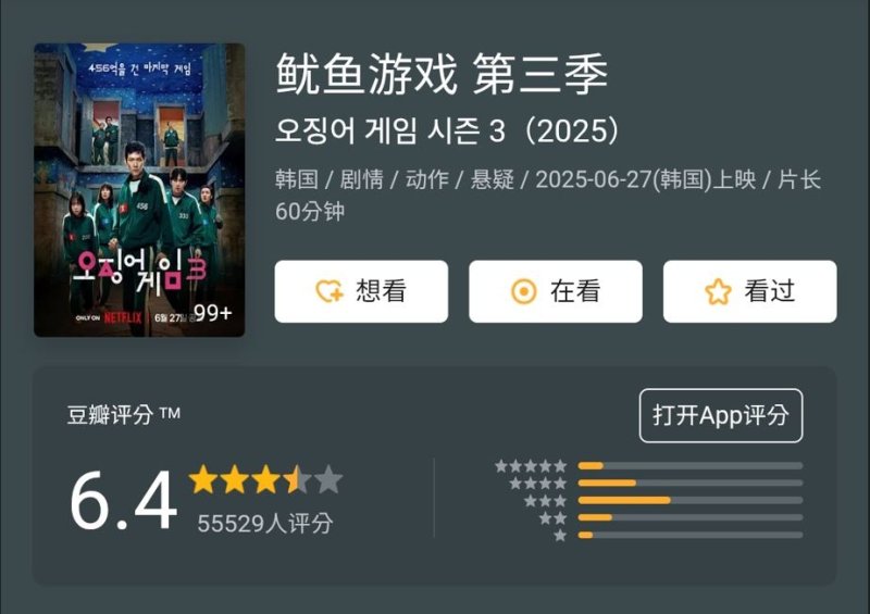 지난 3일 기준 중국 최대 리뷰 사이트 '더우반'(Douban)에는 '오징어게임3' 관련 리뷰가 2만1000여 건 등록됐으며 별점 평가에는 5만5000여 명이 참여한 것으로 집계됐다. ‘오징어게임3’가 지난달 27일 공개된 점을 감안하면, 단기간 동안 5만명이 넘는 중국인이 '불법 유통-시청'을 통해 ‘오징어게임3’를 시청했다는 뜻이다.