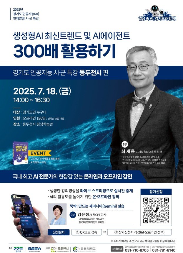 첫 특강은 오는 18일 동두천시 평생학습관에서 진행되며, 1부에서는 최재용 디지털융합교육원장이 '생성형 AI 최신 트렌드 및 AI에이전트 300배 활용하기'를 주제로 생성형 AI의 개념과 프롬프트 엔지니어링, 실전 활용 전략을 소개한다.