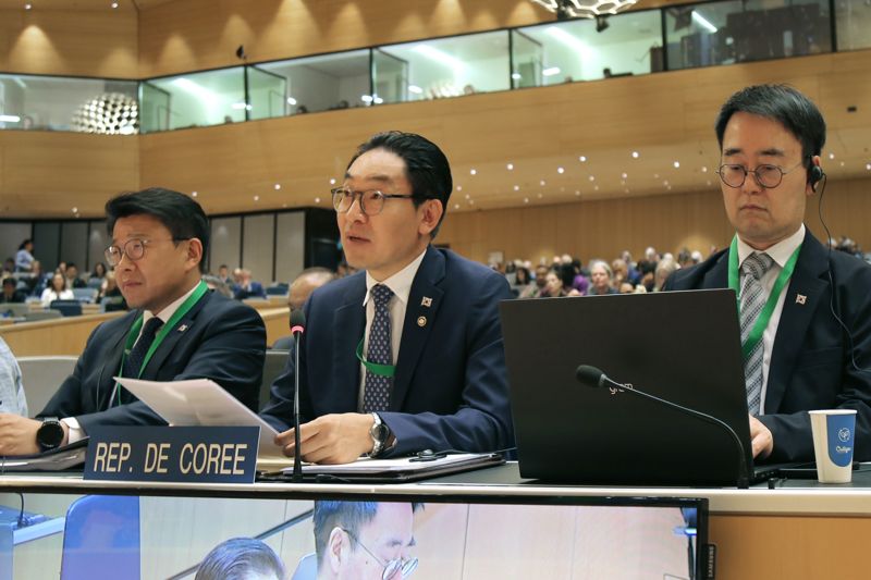 김완기 특허청장(가운데)이 8일 오후(현지시각) 스위스 제네바 세계지식재산기구(WIPO) 본부에서 열린 제66차 총회에서 대표연설을 하고 있다.