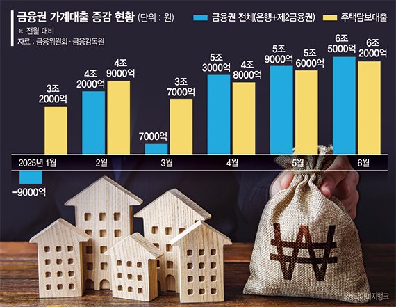 금융당국이 9일 발표한 '6월 중 가계대출 동향'에 따르면 지난달 전 금융권 가계대출은 6조5000억원 늘었다. 이 같은 증가 폭은 전월(5조9000억원)보다 확대된 것이자 지난해 10월(6조5000억원) 이후 8개월 만에 가장 큰 수준이다.