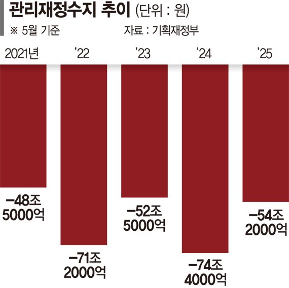 한편 올해 1차 추가경정예산(추경)이 반영된 관리재정수지 적자 규모가 54조2000억원 수준으로 집계됐다. 국세 수입이 크게 늘며 적자 폭은 지난해보다 줄었지만, 향후 2차 추경 집행까지 고려하면 재정건전성은 더 악화될 것으로 전망된다.