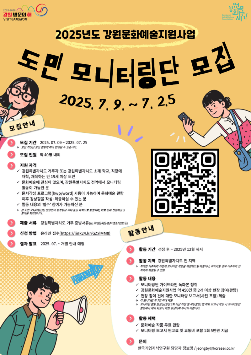 【파이낸셜뉴스 춘천=김기섭 기자】강원문화재단은 다양한 예술가의 공연 및 작품을 직접 만날 수 있는 강원문화예술지원사업 도민 모니터링단을 오는 25일까지 모집한다고 15일 밝혔다.