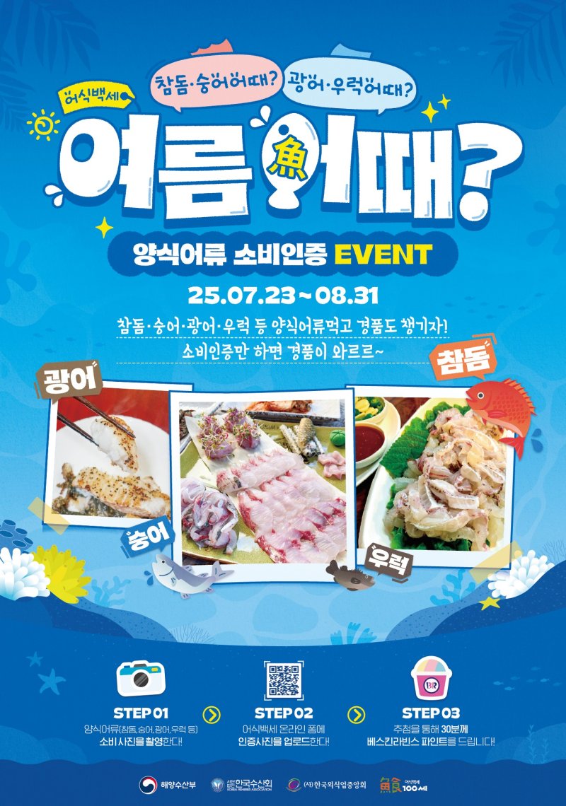 [파이낸셜뉴스] 해양수산부는 여름철 양식수산물 소비를 활성화하기 위해 오는 23일부터 다음 달 31일까지 한국수산회·한국외식업중앙회·수협중앙회와 함께 '어식백세-여름어(魚)때?' 캠페인을 한다고 밝혔다.