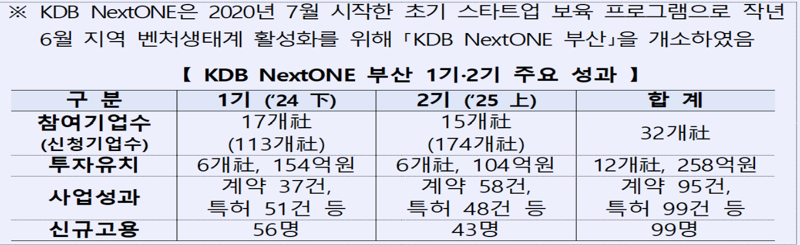 'KDB NextONE 부산'은 출범 이후 1, 2기 32개사 보육을 완료했으며 이 중 12개사가 보육기간 중 258억원의 투자유치에 성공했다.