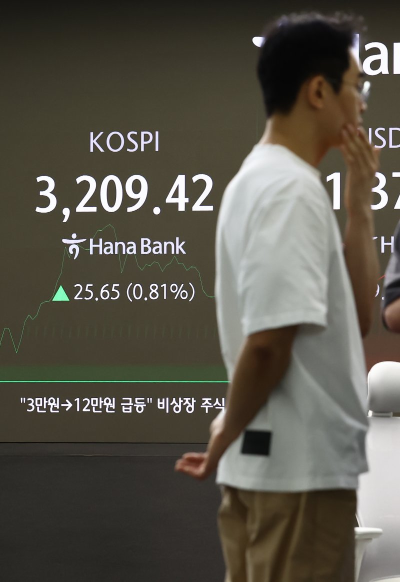 24일 오전 서울 중구 하나은행 본점 딜링룸 전광판에 코스피 지수가 3209.42를 가리키고 있다. 뉴스1 제공