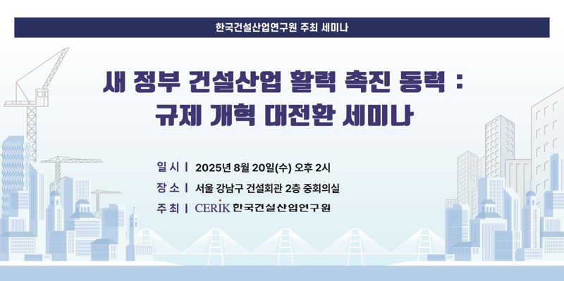 [파이낸셜뉴스] 한국건설산업연구원은 오는 8월 20일 서울 강남구 건설회관에서 ‘새 정부 건설산업 활력 촉진 동력: 규제 개혁 대전환 세미나’를 개최한다고 25일 밝혔다.