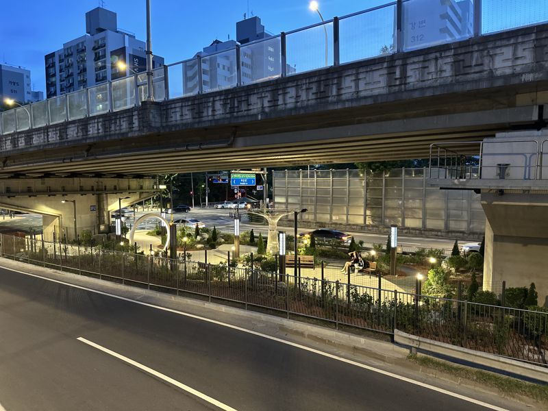 특히 고가 하부의 특성상 채광과 빗물 공급이 어려운 점을 극복하기 위해 생육등(식물 생장에 도움을 주는 LED) 설치와 자동 관수 시스템을 도입하고, 그늘에서도 잘 자라는 내음성 수종을 중심으로 식재했다.