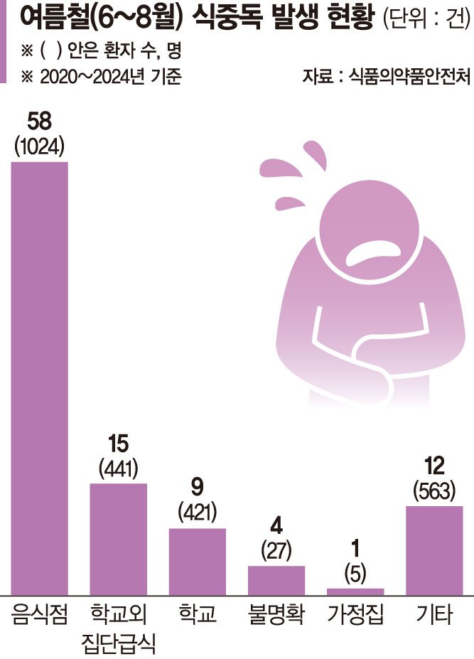 최근 5년간 여름철(6~8월) 식중독 사고로 인한 환자 수가 매년 평균 2400명대에 이르는 것으로 나타났다. 식중독 발생 장소로는 음식점이 전체의 과반(58%)을 넘어섰다. 이에 정부는 매년 되풀이되는 여름철 식중독 사고를 사전에 막기 위한 국민 예방 캠페인을 한층 강화하는 등 '국민 건강 챙기기' 총력전에 나서고 있다.