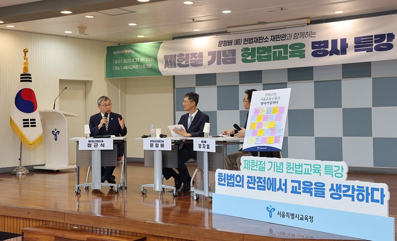 이와함께 제헌절을 맞아 지난 21일 서울 관내 교장, 교감, 수석교사를 대상으로 문형배 전 헌법재판관 초청 특강을 진행했다. 문 전 재판관은 헌법 제10조 '모든 국민은 인간으로서의 존엄과 가치를 가지며, 행복을 추구할 권리를 가진다'는 조항을 중심으로, 헌법이 교육의 본질과 일상에 어떻게 연결되는지 강조했다.
